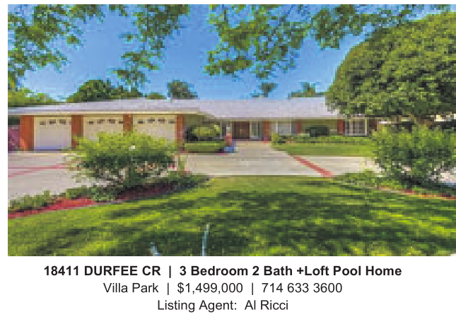 18411 DURFEE CR | 3 Bedroom 2Bath +Loft Pool Home Villa Park | $1,499,000 | 714 633 3600 Listing Agent: AlRicci