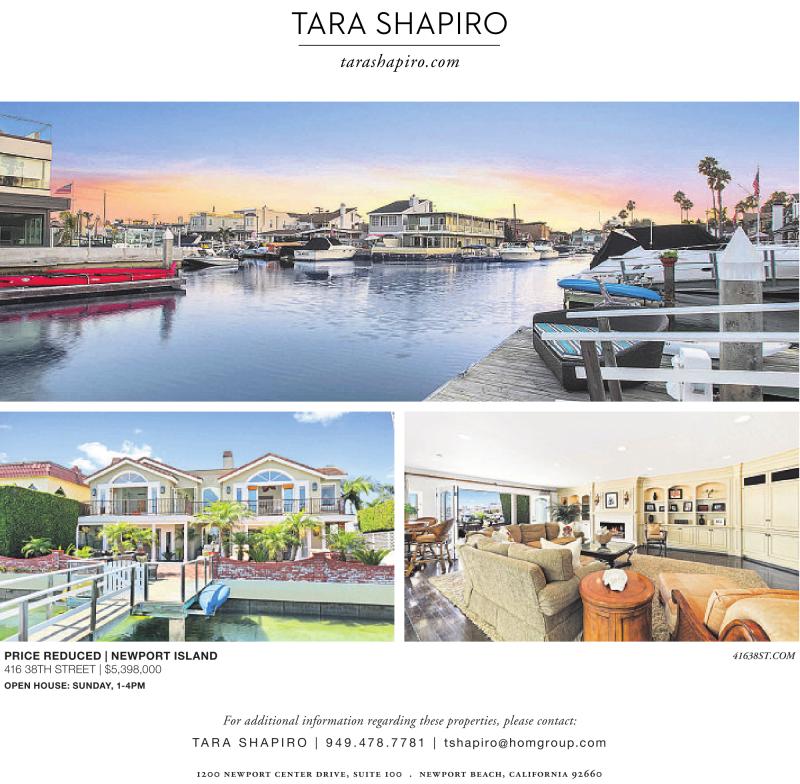 PRICE REDUCED | NEWPORT ISLAND 416 38TH STREET | $5,398,000 OPEN HOUSE: SUNDAY, 1-4PM For additional information regarding these properties, please contact: TA R A S H A PI R O | 9 4 9. 478 .7 781 | tshapiro@homgroup.com 1200 newport center drive, suite 100 . newport beach, california 92660 41638ST.COM