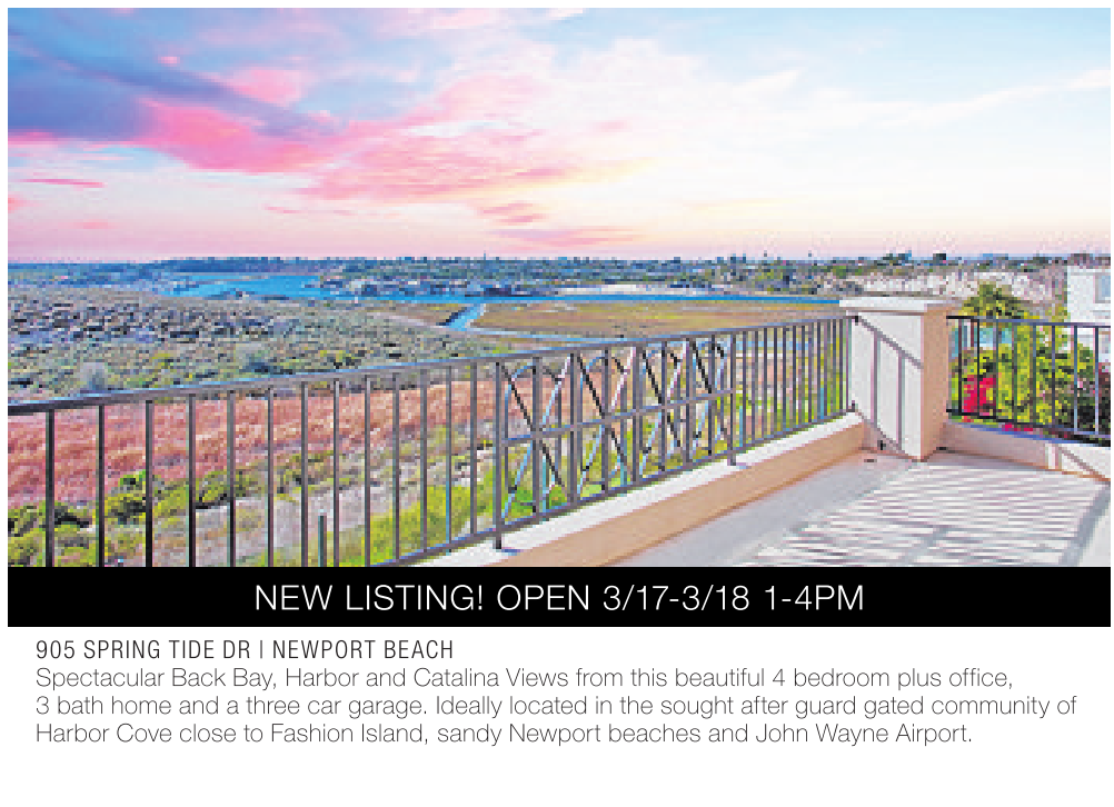 NEW LISTING! OPEN 3/17-3/18 1-4PM 905 SPRING TIDE DR | NEWPORT BEACH Spectacular Back Bay, Harbor and Catalina Views from this beautiful 4 bedroom plus office, 3 bath home and a three car garage. Ideally located in the sought after guard gated community of Harbor Cove close to Fashion Island, sandy Newport beaches and John Wayne Airport.