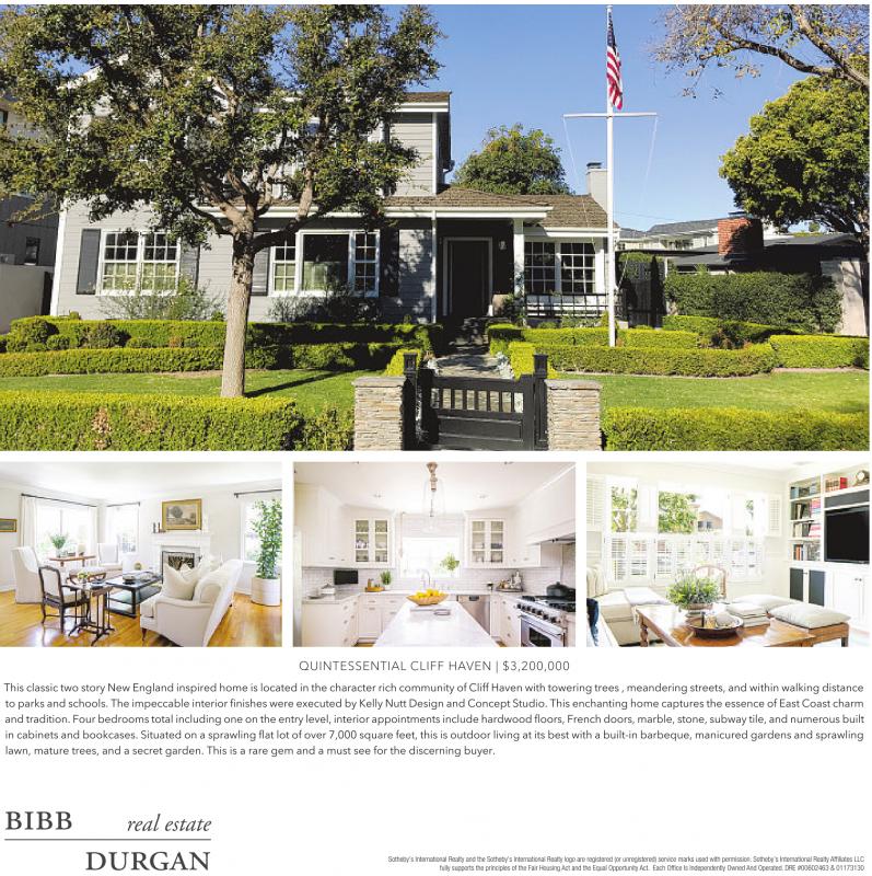 QUINTESSENTIAL CLIFF HAVEN | $3,200,000 This classic two story New England inspired home is located in the character rich community of Cliff Haven with towering trees ,meandering streets, and within walking distance to parks and schools. The impeccable interior finishes were executed by Kelly Nutt Design and Concept Studio. This enchanting home captures the essence of East Coast charm and tradition. Four bedroomstotal including oneonthe entry level, interior appointments includehardwood floors,French doors,marble, stone,subway tile,and numerousbuilt in cabinets and bookcases. Situated on a sprawling flat lot of over 7,000 square feet, this is outdoor living at its best with a built-in barbeque, manicured gardens and sprawling lawn, mature trees, and a secret garden. This is a rare gem and a must see for the discerning buyer. Sotheby’s International Realty and the Sotheby’s International Realty logo are registered (or unregistered) service marks used with permission. Sotheby’s International Realty Affiliates LLC fullysupportsthe principles of the Fair Housing Act and the Equal Opportunity Act. Each Office Is IndependentlyOwned And Operated. DRE #00602463 &01173130