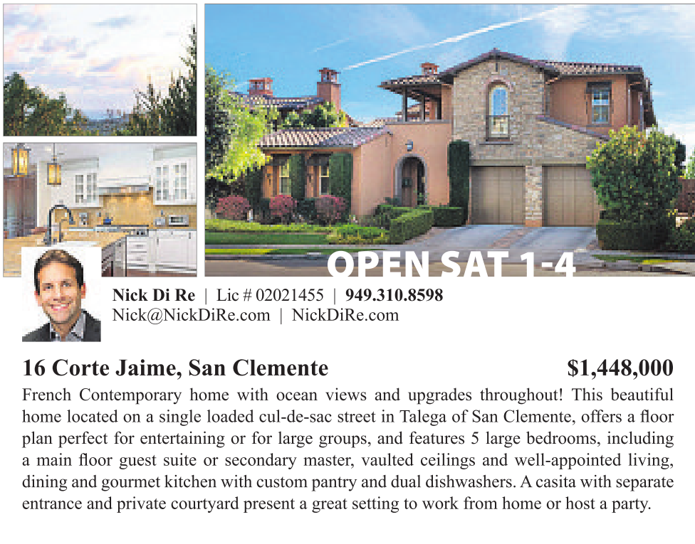 OPEN SAT 1-4 Nick Di Re | Lic #02021455 | 949.310.8598 Nick@NickDiRe.com | NickDiRe.com 16 Corte Jaime, San Clemente $1,448,000 F plan perfect for entertaining or for large groups, and features 5 large bedrooms, including dining and gourmet kitchen with custom pantry and dual dishwashers. Acasita withseparate entrance and private courtyard present a great setting to work from home or host a party. See also