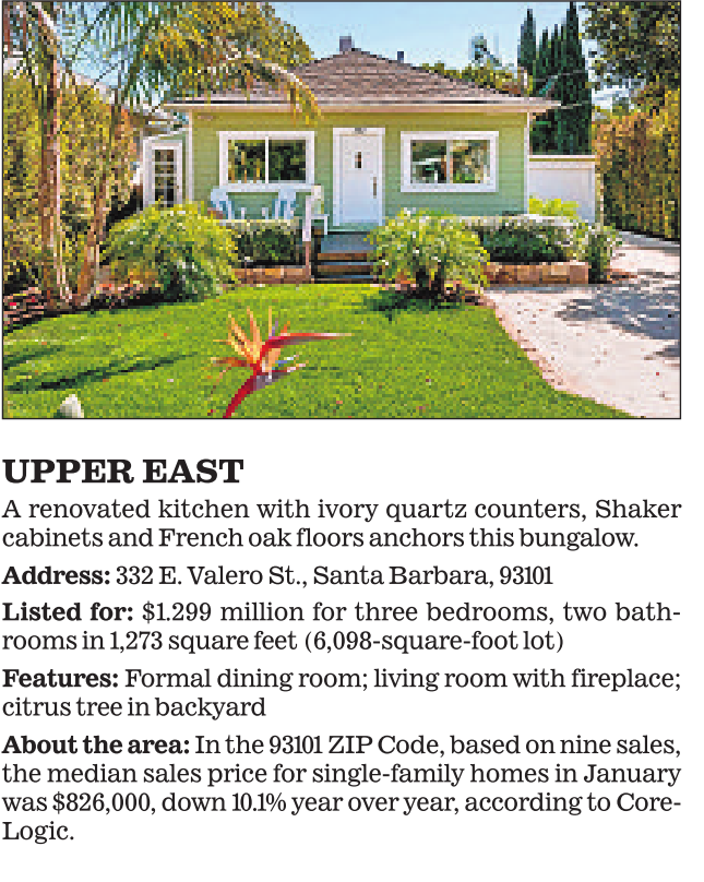 UPPER EAST A renovated kitchen with ivory quartz counters, Shaker cabinets and French oak floors anchors this bungalow. Address: 332 E. Valero St., Santa Barbara, 93101 Listed for: $1.299 million for three bedrooms, two bathrooms in 1,273 square feet (6,098-square-foot lot) Features: Formal dining room; living room with fireplace; citrus tree in backyard About the area: In the 93101 ZIP Code, based on nine sales, the median sales price for single-family homes in January was $826,000, down 10.1% year over year, according to Core- Logic. See also