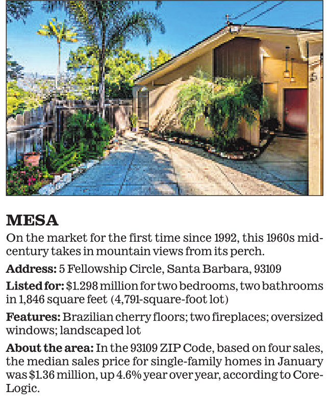 MESA On the market for the first time since 1992, this 1960s midcentury takes in mountain views from its perch. Address: 5 Fellowship Circle, Santa Barbara, 93109 Listed for: $1.298 million for two bedrooms, two bathrooms in 1,846 square feet (4,791-square-foot lot) Features: Brazilian cherry floors; two fireplaces; oversized windows; landscaped lot About the area: In the 93109 ZIP Code, based on four sales, the median sales price for single-family homes in January was $1.36 million, up 4.6% year over year, according to Core- Logic. See also