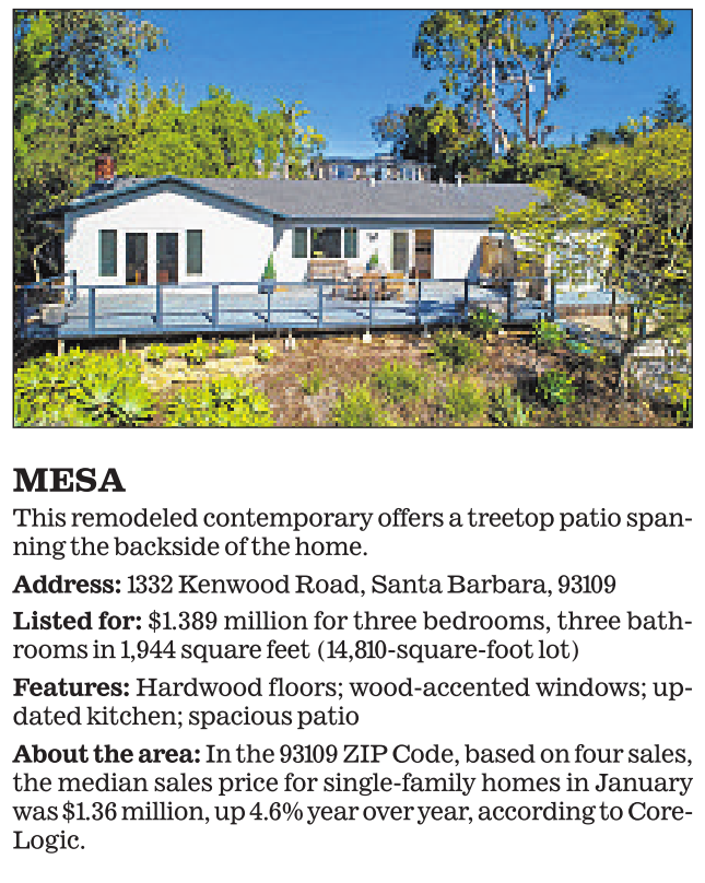 About the area: In the 93109 ZIP Code, based on four sales, the median sales price for single-family homes in January was $1.36 million, up 4.6% year over year, according to Core- Logic.