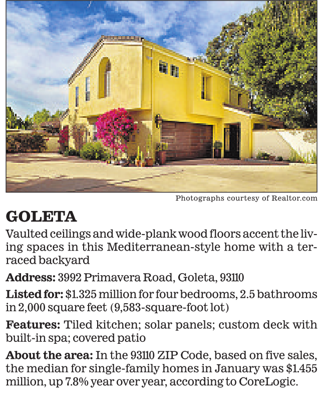 GOLETA Vaulted ceilings and wide-plank wood floors accent the living spaces in this Mediterranean-style home with a terraced backyard Address: 3992 Primavera Road, Goleta, 93110 Photographs courtesy of Realtor.com Listed for: $1.325 million for four bedrooms, 2.5 bathrooms in 2,000 square feet (9,583-square-foot lot) Features: Tiled kitchen; solar panels; custom deck with built-in spa; covered patio About the area: In the 93110 ZIP Code, based on five sales, the median for single-family homes in January was $1.455 million, up 7.8% year over year, according to CoreLogic. See also