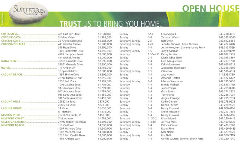 COSTA MESA..................................................... 421 East 20 th Street $1,158,888 Sunday 12-3 Erica Seigred 949.230.4416 COTO DE CAZA................................................. 3 Palma Valley $1,388,000 Sunday 1-4 Tamorah Weiss 949.285.8060 CRYSTAL COVE.................................................. 22 Archipelago Drive $5,688,000 Saturday | Sunday 2-5 Rob Smith 949.697.8855 CORONA DEL MAR ........................................... 441 Isabella Terrace $6,900,000 Saturday | Sunday Appt. Jennifer Thomas | Brian Thomas 949.422.6407 316 Hazel Drive $5,395,000 Sunday 1-4 Jessie Holechek | Summer Lynne Perry 949.315.1529 1306 Sandcastle Drive $3,795,000 Saturday | Sunday 1-5 Jody Chapman 949.689.8594 4709 Hampden Road $3,600,000 Saturday 1:30-4:30 Penny Pattillo 949.632.2252 414 Orchid Avenue $2,000,000 Sunday 2-4 Merle Tabor Stern 949.933.3367 DANA POINT ..................................................... 33961 Granada Drive $2,890,000 Saturday 1-4 Fred Albuquerque 949.233.1788 33961 Granada Drive $2,890,000 Sunday 1-4 Kelly Mortensen 949.629.8618 IRVINE ................................................................ 117 Amber Sky $3,795,000 Sunday 1-4 Jacqueline Thompson 949.326.3392 10 Spanish Moss $2,088,000 Saturday | Sunday 1-5 Claire Na 949.536.4014 LAGUNA BEACH................................................ 1594 Skyline Drive $3,395,000 Sunday 1-4 Jace Horton 714.833.1730 22190 Paseo Del Sur $2,799,000 Sunday 1-4 Amanda Horton 949.422.6122 2850 Park Place $2,799,000 Saturday | Sunday 1-4 Marcus Skendarian 949.295.5758 1016 Catalina Street $1,799,000 Saturday 1-4 Brendy Michael 949.533.1740 947 Acapulco Street $1,789,000 Saturday 1-4 Jason Phipps 949.285.8988 947 Acapulco Street $1,789,000 Sunday 1-4 Gary Boisen 949.274.2236 911 Santa Ana Street $1,450,000 Saturday 1-4 Tony Florez 949.235.7034 911 Santa Ana Street $1,450,000 Sunday 1-4 Angela Carnago 949.235.7034 LAGUNA HILLS.................................................. 25822 La Serra $879,000 Saturday 1-4 Kathy Garrison 949.278.9528 25822 La Serra $879,000 Sunday 1-4 Donna Peebles 949.278.9528 LAGUNA NIGUEL............................................... 14 Minori $1,630,000 Saturday 1-4 Nancy Cloward 949.606.6116 6 Tidemark $1,275,000 Sunday 1-4 Sherri McDaniel 949.293.7495 MISSION VIEJO.................................................. 26236 Via Roble, 31 $450,000 Sunday 1-4 Nancy Cloward 949.606.6116 NEWPORT COAST ............................................. 7 Montreaux $1,798,000 Saturday 11:30-2 Erica Seigred 949.230.4416 NELLIE GAIL RANCH......................................... 27192 Hidden Trail Road $2,395,000 Saturday | Sunday 1-4:30 Jerry La Mott 949.463.6532 NEWPORT BEACH ............................................. 119 Via Koron $4,850,000 Saturday | Sunday 1-4 Patricia Carson 949.478.7802 ............................................................................ 1007 Mariners Drive $4,600,000 Saturday 1-4 Esther Fine 949.466.6483 1007 Mariners Drive $4,600,000 Sunday 1-4 Max Nejad 949.423.9229 2025 Port Cardiff Place $4,500,000 Saturday | Sunday 1-4 Eric Neff 949.500.7119 1406 Antigua Way $4,200,000 Sunday 1-4 Genille Lauren | Summer Lynne Perry 949.280.1940