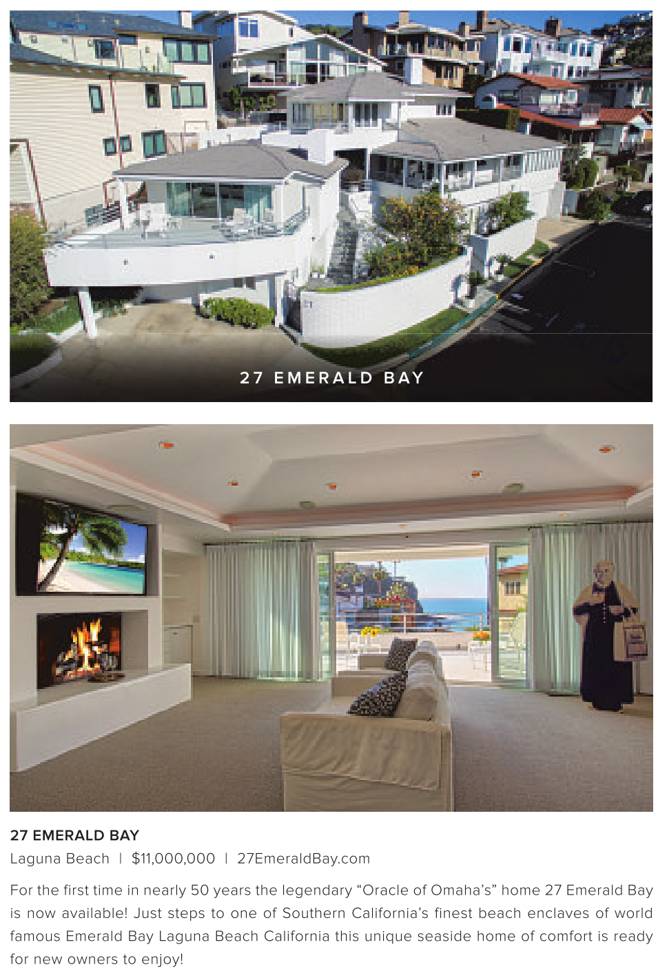For the first time in nearly 50 years the legendary “Oracle of Omaha’s” home 27 Emerald Bay is now available! Just steps to one of Southern California’s finest beach enclaves of world famous Emerald Bay Laguna Beach California this unique seaside home of comfort is ready for new owners to enjoy!