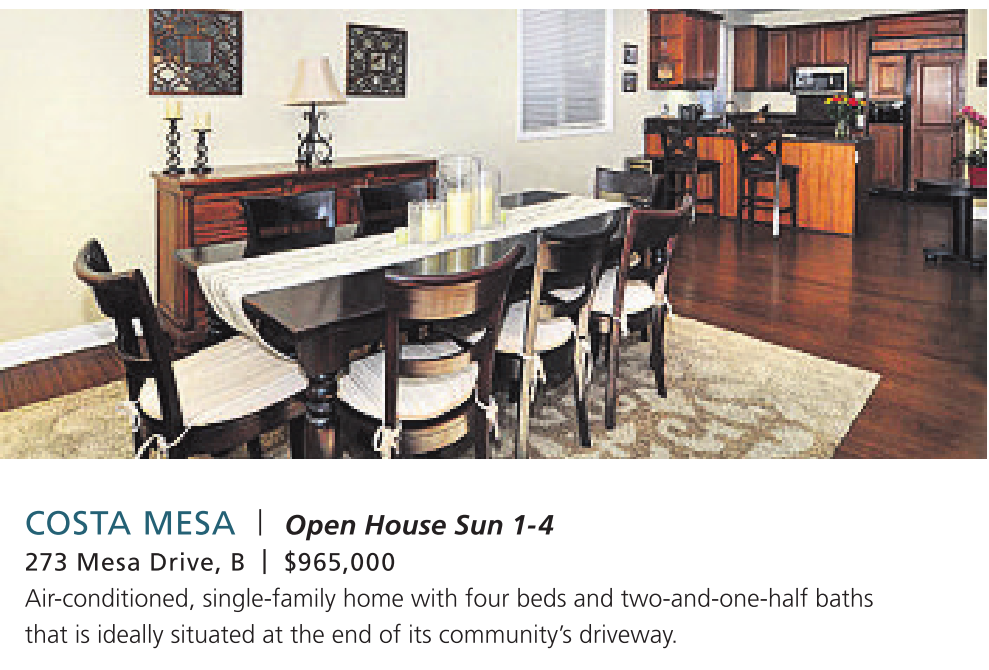 273 Mesa Drive, B | $965,000 Air-conditioned, single-family home with four beds and two-and-one-half baths that is ideally situated at the end of its community’s driveway.