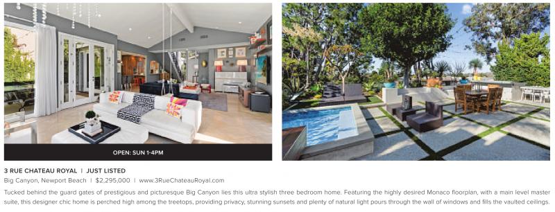 3 RUE CHATEAU ROYAL | JUST LISTED Big Canyon, Newport Beach | $2,295,000 | www.3RueChateauRoyal.com Tucked behind the guard gates of prestigious and picturesque Big Canyon lies this ultra stylish three bedroom home. Featuring the highly desired Monaco floorplan, with a main level master suite, this designer chic home is perched high among the treetops, providing privacy, stunning sunsets and plenty of natural light pours through the wall of windows and fills the vaulted ceilings.