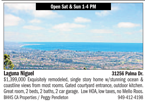 $1,399,000 Exquisitely remodeled, single story home w/stunning ocean & coastline views from most rooms. Gatedcourtyard entrance, outdoor kitchen. Greatroom, 2beds, 2baths, 2car garage. Low HOA, low taxes, no MelloRoos. BHHSCAProperties /PeggyPendleton 949-412-4198