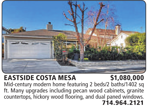 EASTSIDE COSTA MESA $1,080,000 Mid-century modern home featuring 2beds/2 baths/1402 sq ft. Many upgrades including pecan wood cabinets,granite countertops,hickory wood flooring, and dual paned windows.