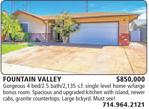 FOUNTAIN VALLEY $850,000 Gorgeous 4bed/2.5 bath/2,135 s.f. single level home w/large bonus room. Spacious and upgraded kitchen with island, newer cabs,granite countertops.Large bckyrd. Must see!
