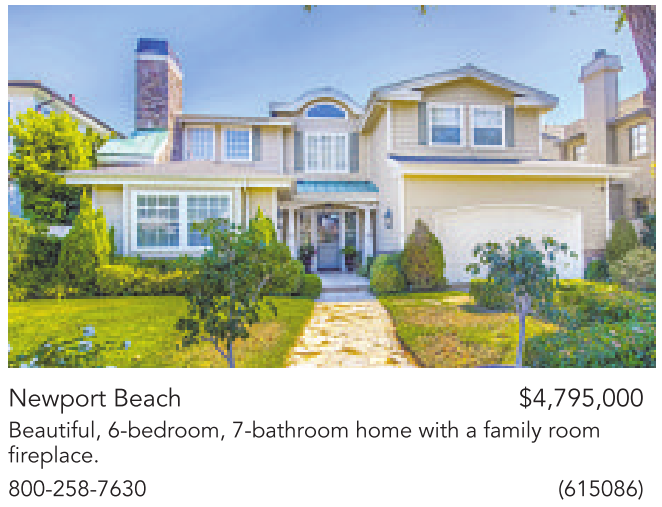 Newport Beach $4,795,000 Beautiful, 6-bedroom, 7-bathroom home with a family room fireplace.