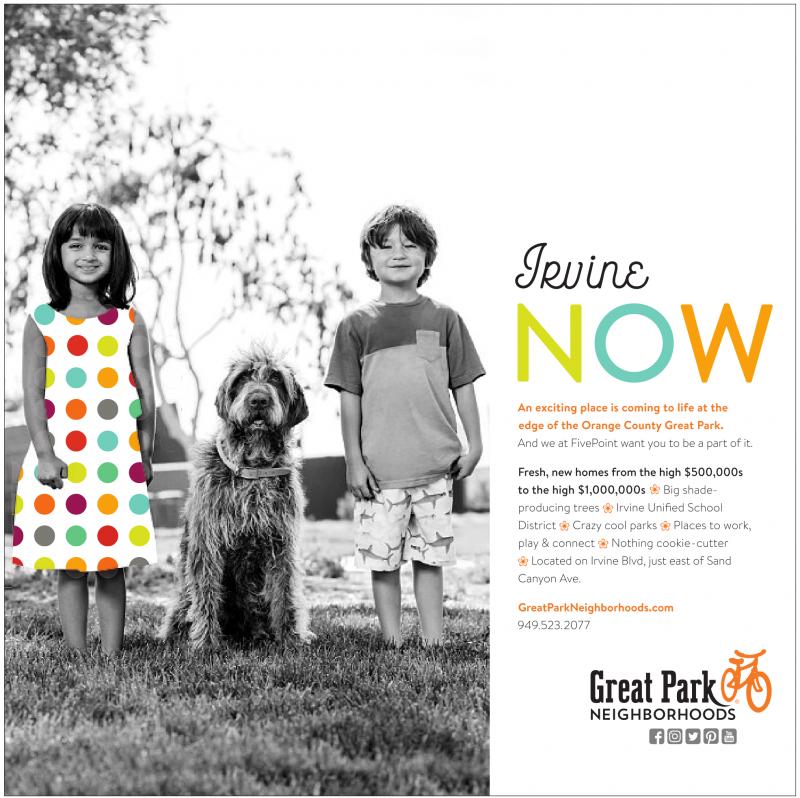 Irvine NOW An exciting place is coming to life at the edge of the Orange County Great Park. And we at FivePoint want you to be a part of it. Fresh, new homes from the high $500,000s to the high $1,000,000s Big shadeproducing trees Irvine Unified School District Crazy cool parks Places to work, play & connect Nothing cookie-cutter Located on Irvine Blvd, just east of Sand Canyon Ave. GreatParkNeighborhoods.com 949.523.2077