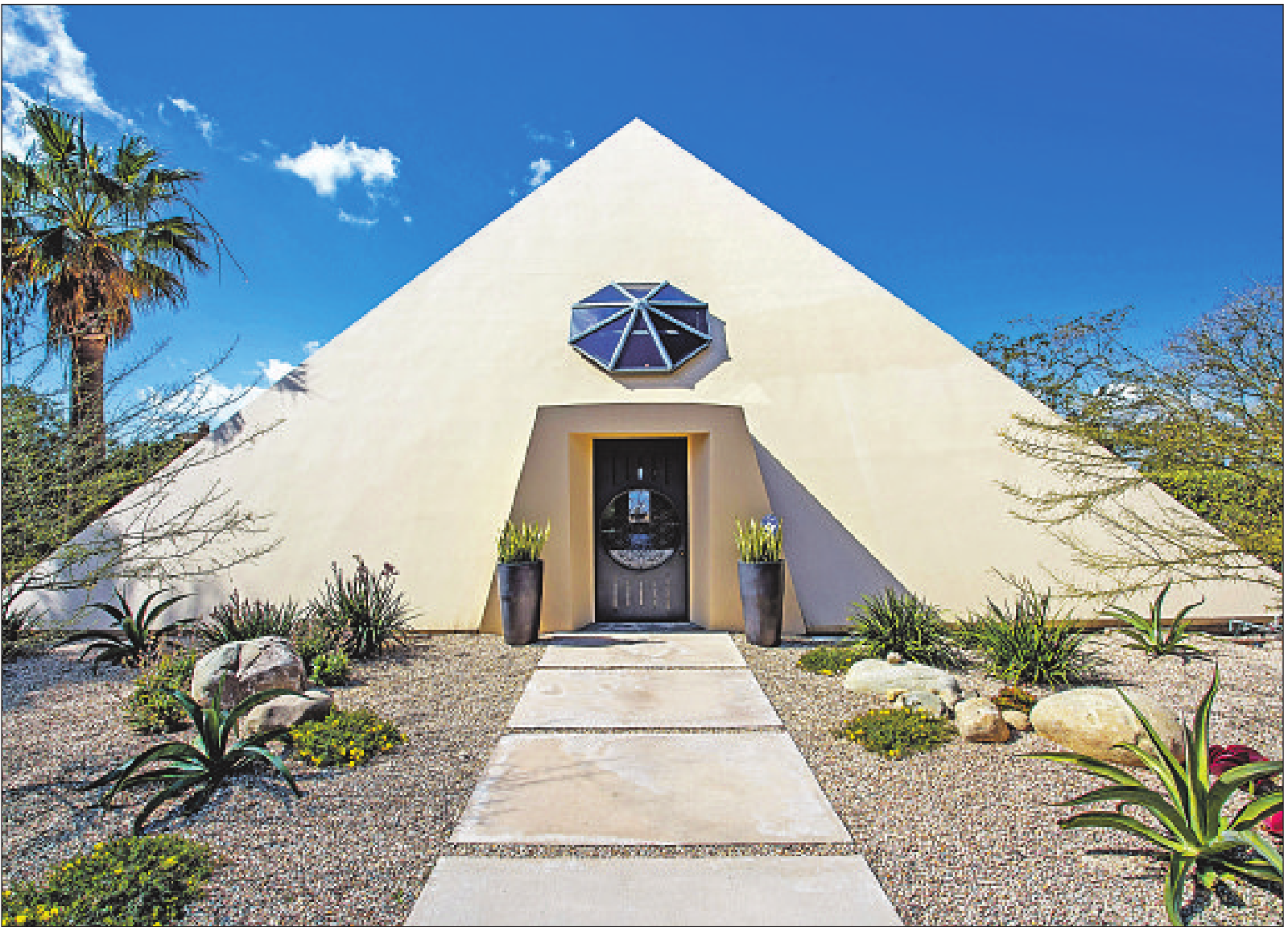 This one-of-a-kind residence looks like it belongs in the swirling sands of Giza rather than on a hilltop in Malibu. The three-bedroom house was designed for two astronomy photographers and built to face the magnetic north like the needle of a compass. Sitting on one of the highest points in the Santa Monica Mountains, it has perfect vantage for observing the ocean as well as the movements of the sun and moon.