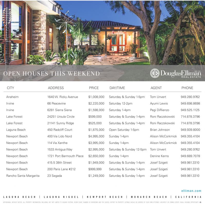 Anaheim 1640 W. Ricky Avenue $1,008,000 Saturday & Sunday 1-5pm Tom Unvert 949.280.9762