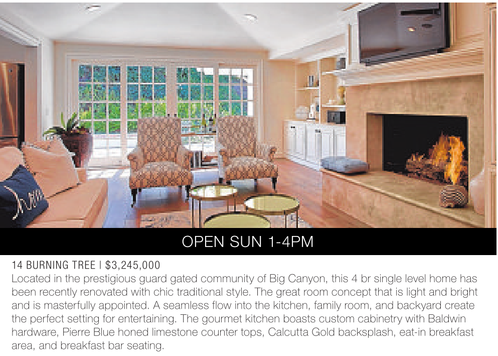 14 BURNING TREE | $3,245,000 Located in the prestigious guard gated community of Big Canyon, this 4 br single level home has been recently renovated with chic traditional style. The great room concept that is light and bright and is masterfully appointed. A seamless flow into the kitchen, family room, and backyard create the perfect setting for entertaining. The gourmet kitchen boasts custom cabinetry with Baldwin hardware, Pierre Blue honed limestone counter tops, Calcutta Gold backsplash, eat-in breakfast area, and breakfast bar seating.