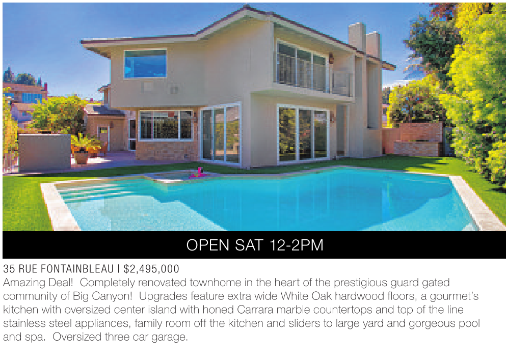 35 RUE FONTAINBLEAU | $2,495,000 Amazing Deal! Completely renovated townhome in the heart of the prestigious guard gated community of Big Canyon! Upgrades feature extra wide White Oak hardwood floors, a gourmet’s kitchen with oversized center island with honed Carrara marble countertops and top of the line stainless steel appliances, family room off the kitchen and sliders to large yard and gorgeous pool and spa. Oversized three car garage.