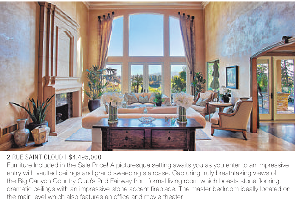 2 RUE SAINT CLOUD | $4,495,000 Furniture Included in the Sale Price! A picturesque setting awaits you as you enter to an impressive entry with vaulted ceilings and grand sweeping staircase. Capturing truly breathtaking views of the Big Canyon Country Club’s 2nd Fairway from formal living room which boasts stone flooring, dramatic ceilings with an impressive stone accent fireplace. The master bedroom ideally located on the main level which also features an office and movie theater.