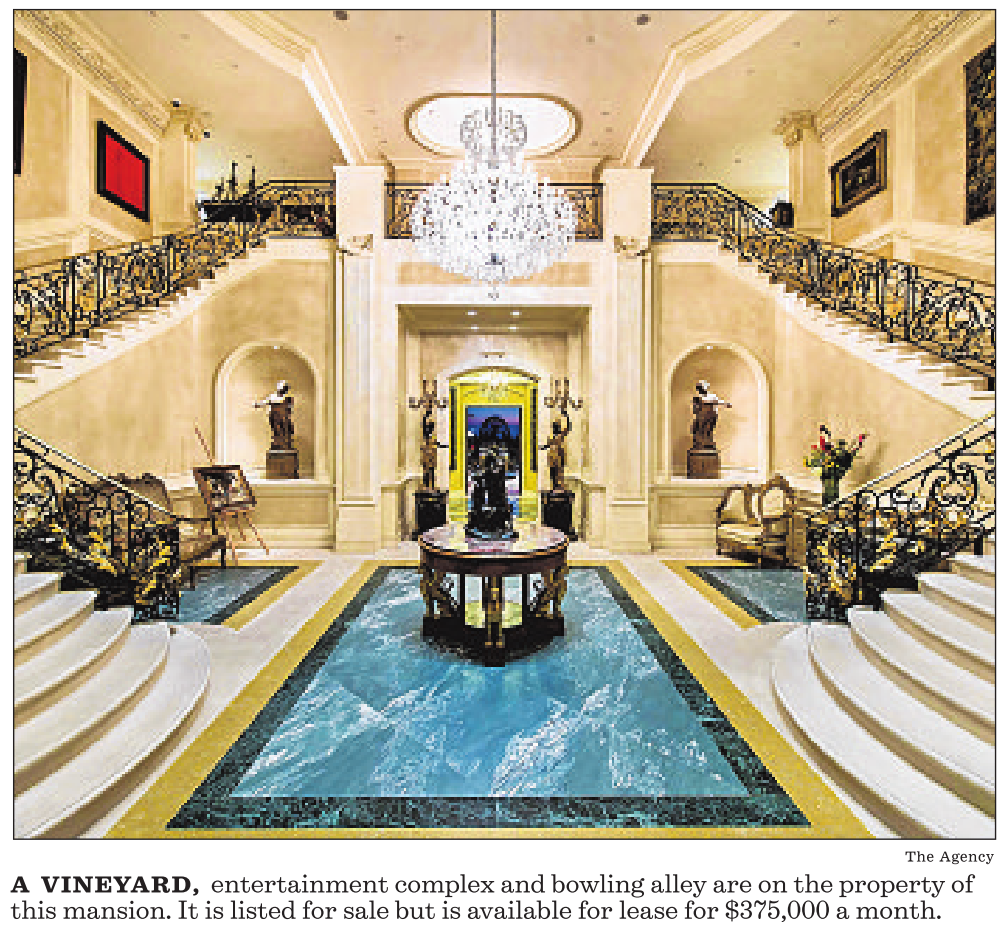 A VINEYARD, entertainment complex and bowling alley are on the property of this mansion. It is listed for sale but is available for lease for $375,000 a month.