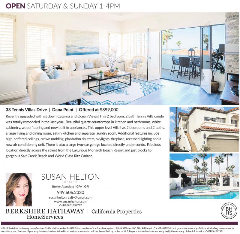 OPEN 33 Tennis Villas Drive | Dana Point | $899,000 Recently upgraded with sit down Catalina and Ocean Views! This 2 bedroom, 2 bath Tennis Villa condo SUSAN HELTON R E A LT Y 949.606.2330 susanheltonrealty@gmail.com www.susanhelton.com CalBRE#01854787 ©2018 BerkshireHathawayHomeServices California Properties (BHHSCP) is amember of thefranchise system of BHH Affiliates LLC. BHHAffiliates LLCand BHHSCP do not guarantee accuracyofall dataincluding measurements, conditions,and features of property.Information is obtained from various sourcesand will not be verified by broker or MLS. Buyer is advised to independently verify the accuracyofthat information. CalBRE 01317331