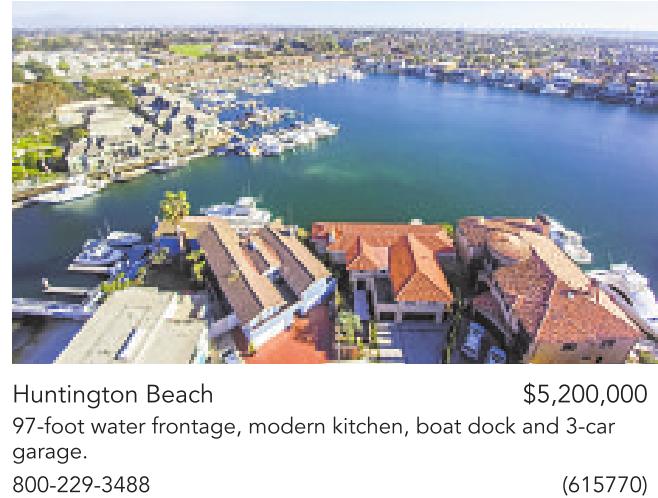 Huntington Beach $5,200,000 97-foot water frontage, modern kitchen, boat dock and 3-car garage.