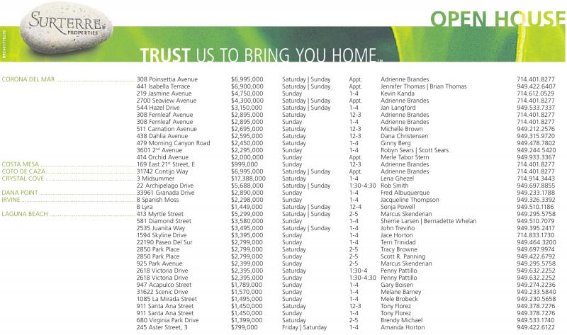 CORONA DEL MAR ............................................. 308 Poinsettia Avenue $6,995,000 Saturday | Sunday Appt. Adrienne Brandes 714.401.8277 441 Isabella Terrace $6,900,000 Saturday | Sunday Appt. Jennifer Thomas | Brian Thomas 949.422.6407 219 Jasmine Avenue $4,750,000 Sunday 1-4 Kevin Kanda 714.612.0529 2700 Seaview Avenue $4,300,000 Saturday | Sunday Appt. Adrienne Brandes 714.401.8277 544 Hazel Drive $3,150,000 Saturday | Sunday 1-4 Jan Langford 949.533.7337 308 Fernleaf Avenue $2,895,000 Saturday 12-3 Adrienne Brandes 714.401.8277 308 Fernleaf Avenue $2,895,000 Sunday 1-4 Adrienne Brandes 714.401.8277 511 Carnation Avenue $2,695,000 Saturday 12-3 Michelle Brown 949.212.2576 438 Dahlia Avenue $2,595,000 Saturday 12-3 Dana Christensen 949.315.9720 479 Morning Canyon Road $2,450,000 Saturday 1-4 Ginny Berg 949.478.7802 3601 2 nd Avenue $2,295,000 Sunday 1-4 Robyn Sears | Scott Sears 949.244.5420 414 Orchid Avenue $2,000,000 Sunday Appt. Merle Tabor Stern 949.933.3367 COSTA MESA ...................................................... 169 East 21 st Street, E $999,000 Sunday 12-3 Adrienne Brandes 714.401.8277 COTO DE CAZA................................................... 31742 Contijo Way $6,995,000 Saturday | Sunday Appt. Adrienne Brandes 714.401.8277 CRYSTAL COVE ................................................... 3 Midsummer $17,388,000 Saturday 1-4 Lena Ghezel 714.914.3443 22 Archipelago Drive $5,688,000 Saturday | Sunday 1:30-4:30 Rob Smith 949.697.8855 DANA POINT....................................................... 33961 Granada Drive $2,890,000 Sunday 1-4 Fred Albuquerque 949.233.1788 IRVINE ................................................................. 8 Spanish Moss $2,298,000 Sunday 1-4 Jacqueline Thompson 949.326.3392 8 Lyra $1,449,000 Saturday | Sunday 12-4 Sonja Powell 949.510.1186 LAGUNA BEACH................................................. 413 Myrtle Street $5,299,000 Saturday | Sunday 2-5 Marcus Skenderian 949.295.5758 581 Diamond Street $3,580,000 Sunday 1-4 Sherrie Larsen | Bernadette Whelan 949.510.7079 2535 Juanita Way $3,495,000 Saturday | Sunday 1-4 John Treviño 949.395.2417 1594 Skyline Drive $3,395,000 Sunday 1-4 Jace Horton 714.833.1730 22190 Paseo Del Sur $2,799,000 Sunday 1-4 Terri Trinidad 949.464.3200 2850 Park Place $2,799,000 Saturday 2-5 Tracy Browne 949.697.9974 2850 Park Place $2,799,000 Sunday 2-5 Scott R. Panning 949.422.6792 925 Park Avenue $2,399,000 Sunday 2-5 Marcus Skenderian 949.295.5758 2618 Victoria Drive $2,395,000 Saturday 1:30-4 Penny Pattillo 949.632.2252 2618 Victoria Drive $2,395,000 Sunday 1:30-4:30 Penny Pattillo 949.632.2252 947 Acapulco Street $1,789,000 Sunday 1-4 Gary Boisen 949.274.2236 31622 Scenic Drive $1,570,000 Sunday 1-4 Melane Barney 949.233.5840 1085 La Mirada Street $1,495,000 Sunday 1-4 Mele Brobeck 949.230.5658 911 Santa Ana Street $1,450,000 Saturday 12-3 Tony Florez 949.378.7276 911 Santa Ana Street $1,450,000 Sunday 1-4 Tony Florez 949.378.7276 680 Virginia Park Drive $1,399,000 Saturday 2-5 Brendy Michael 949.533.1740 245 Aster Street, 3 $799,000 Friday | Saturday 1-4 Amanda Horton 949.422.6122