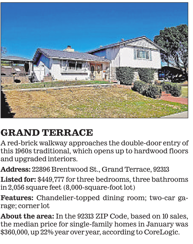 About the area: In the 92313 ZIP Code, based on 10 sales, the median price for single-family homes in January was $360,000, up 22% year over year, according to CoreLogic.