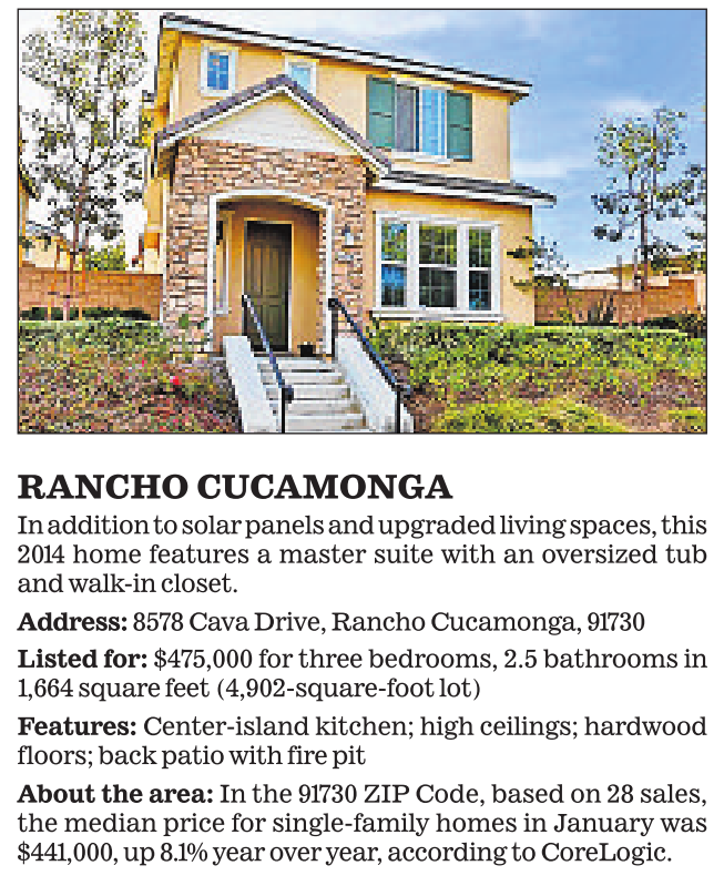 RANCHO CUCAMONGA In addition to solar panels and upgraded living spaces, this 2014 home features a master suite with an oversized tub and walk-in closet. Address: 8578 Cava Drive, Rancho Cucamonga, 91730 Listed for: $475,000 for three bedrooms, 2.5 bathrooms in 1,664 square feet (4,902-square-foot lot) Features: Center-island kitchen; high ceilings; hardwood floors; back patio with fire pit About the area: In the 91730 ZIP Code, based on 28 sales, the median price for single-family homes in January was $441,000, up 8.1% year over year, according to CoreLogic. See also