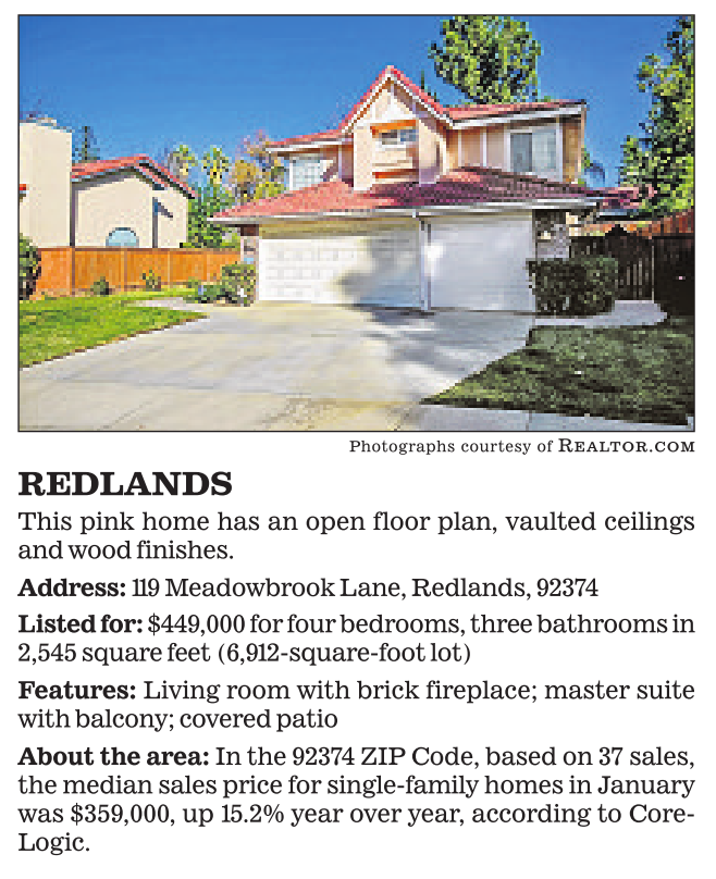 Photographs courtesy of Realtor.com REDLANDS This pink home has an open floor plan, vaulted ceilings and wood finishes. Address: 119 Meadowbrook Lane, Redlands, 92374 Listed for: $449,000 for four bedrooms, three bathrooms in 2,545 square feet (6,912-square-foot lot) Features: Living room with brick fireplace; master suite with balcony; covered patio About the area: In the 92374 ZIP Code, based on 37 sales, the median sales price for single-family homes in January was $359,000, up 15.2% year over year, according to Core- Logic.