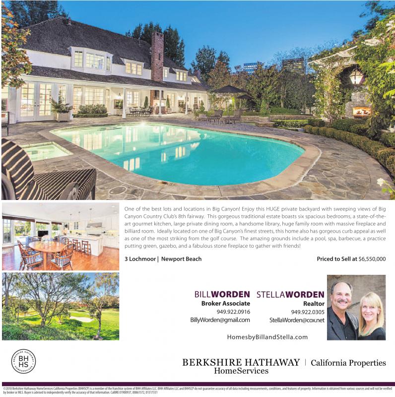 One of the best lots and locations in Big Canyon! Enjoy this HUGE private backyard with sweeping views of Big Canyon Country Club’s 8th fairway. This gorgeous traditional estate boasts six spacious bedrooms, a state-of-theart gourmet kitchen, large private dining room, a handsome library, huge family room with massive fireplace and billiard room. Ideally located on one of Big Canyon’s finest streets, this home also has gorgeous curb appeal as well as one of the most striking from the golf course. The amazing grounds include a pool, spa, barbecue, a practice putting green, gazebo, and a fabulous stone fireplace to gather with friends! 3 Lochmoor | Newport Beach Priced to Sell at $6,550,000 BILLWORDEN Broker Associate 949.922.0916 BillyWorden@gmail.com STELLAWORDEN Realtor 949.922.0305 StellaWorden@cox.net HomesbyBillandStella.com ©2018 Berkshire Hathaway HomeServices California Properties (BHHSCP) is amember of the franchise system of BHH Affiliates LLC. BHH Affiliates LLC and BHHSCP do not guarantee accuracy of all data including measurements, conditions, and features of property. Information is obtained from various sources and will not be verified by broker or MLS. Buyer is advised to independently verify the accuracy of that information. CalBRE 01900937, 00861572, 01317331