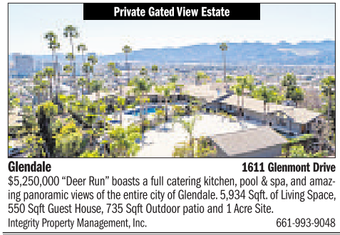 Private Gated View Estate Glendale 1611 Glenmont Drive $5,250,000 “Deer Run” boasts afull catering kitchen, pool &spa, and amazing panoramic views of the entire city of Glendale. 5,934 Sqft. of Living Space, 550 Sqft Guest House, 735 Sqft Outdoor patio and 1AcreSite. IntegrityProperty Management, Inc. 661-993-9048