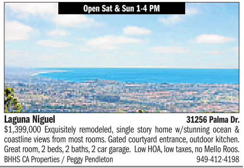 Open Sat &Sun 1-4 PM Laguna Niguel 31256 Palma Dr. $1,399,000 Exquisitely remodeled, single story home w/stunning ocean & coastline views from most rooms. Gated courtyard entrance, outdoor kitchen. Great room, 2beds,2baths, 2car garage. Low HOA, low taxes, no Mello Roos. BHHSCAProperties /PeggyPendleton 949-412-4198
