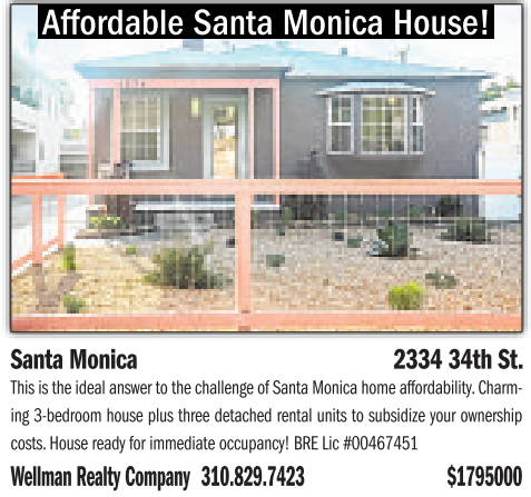 Affordable Santa Monica House! Santa Monica 2334 34th St. This is theideal answer to the challenge of Santa Monica home affordability.Charming 3-bedroom house plus threedetached rental units to subsidize your ownership costs.House readyfor immediateoccupancy! BRELic #00467451 WellmanRealty Company 310.829.7423 $1795000