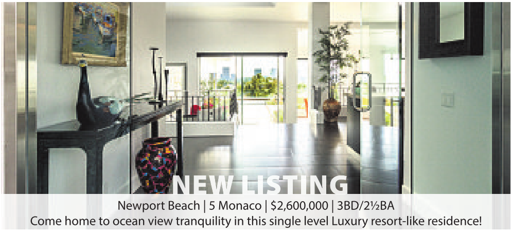NewportBeach |5Monaco|$2,600,000 |3BD/2½BA Come home to ocean view tranquilityinthissingle level Luxuryresort-like residence!