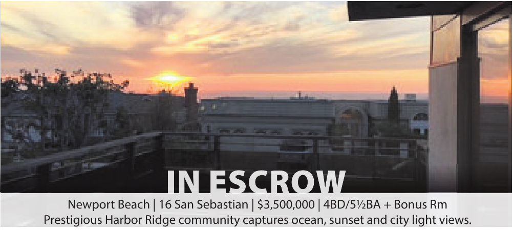 NewportBeach |16San Sebastian |$3,500,000 |4BD/5½BA +Bonus Rm Prestigious Harbor Ridgecommunitycaptures ocean, sunset and citylightviews.