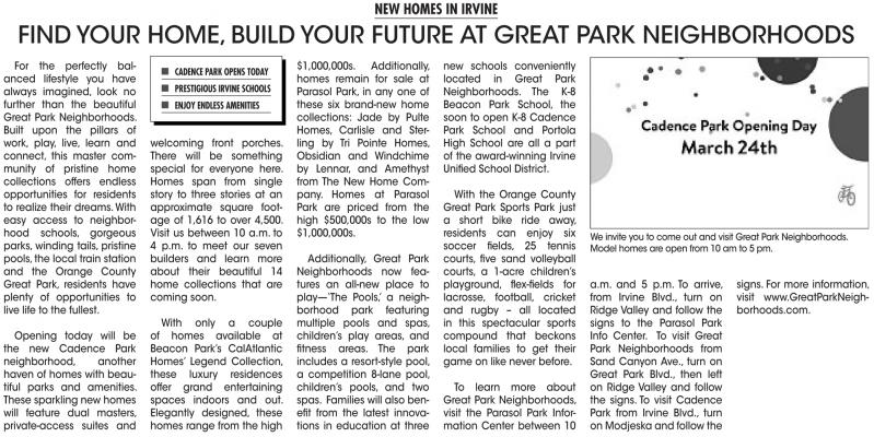 To learn more about Great Park Neighborhoods, visit the Parasol Park Information Center between 10