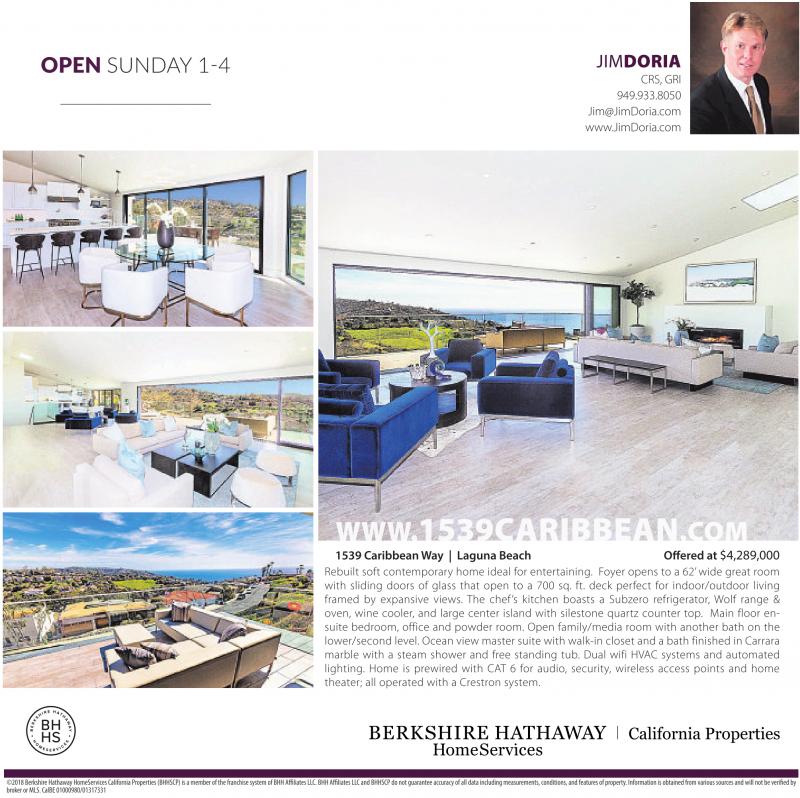 OPEN JIMDORIA CRS, GRI 949.933.8050 Jim@JimDoria.com www.JimDoria.com . 539C BB .CO 1539 Caribbean Way | Laguna Beach Offered at $4,289,000 Rebuilt soft contemporary home ideal for entertaining. Foyer opens to a 62’ wide great room with sliding doors of glass that open to a 700 sq. ft. deck perfect for indoor/outdoor living framed by expansive views. The chef’s kitchen boasts a Subzero refrigerator, Wolf range & oven, wine cooler, and large center island with silestone quartz counter top. Main floor ensuite bedroom, office and powder room. Open family/media room with another bath on the lower/second level. Ocean view master suite with walk-in closet and a bath finished in Carrara marble with a steam shower and free standing tub. Dual wifi HVAC systems and automated lighting. Home is prewired with CAT 6 for audio, security, wireless access points and home theater; all operated with a Crestron system. ©2018 BerkshireHathaway HomeServices California Properties (BHHSCP)isamember of the franchise system of BHH AffiliatesLLC.BHH AffiliatesLLC and BHHSCP do not guaranteeaccuracyofall data including measurements,conditions,and features of property.Information is obtained from varioussources and will not be verified by broker or MLS. CalBE 01000980/01317331