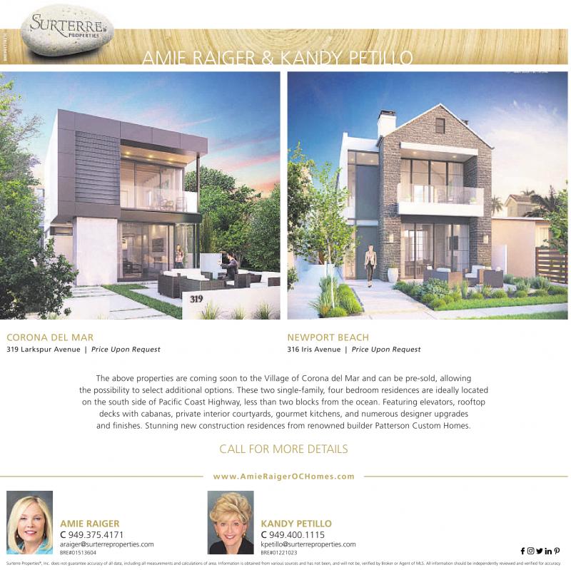 AMIE RAIGER & KANDY PETILLO CORONA DEL MAR 319 Larkspur Avenue | Price Upon Request NEWPORT BEACH 316 Iris Avenue | Price Upon Request The above properties are coming soon to the Village of Corona del Mar and can be pre-sold, allowing the possibility to select additional options. These two single-family, four bedroom residences are ideally located on the south side of Pacific Coast Highway, less than two blocks from the ocean. Featuring elevators, rooftop decks with cabanas, private interior courtyards, gourmet kitchens, and numerous designer upgrades and finishes. Stunning new construction residences from renowned builder Patterson Custom Homes. CALL FOR MORE DETAILS www.AmieRaigerOCHomes.com AMIE RAIGER C 949.375.4171 araiger@surterreproperties.com BRE#01513604 KANDY PETILLO C 949.400.1115 kpetillo@surterreproperties.com BRE#01221023 Surterre Properties ® ,Inc. does not guarantee accuracy of all data, including all measurements and calculations of area. Information is obtained from various sources and has not been, and will not be, verified by Broker or Agent of MLS. All information should beindependently reviewed and verified for accuracy.