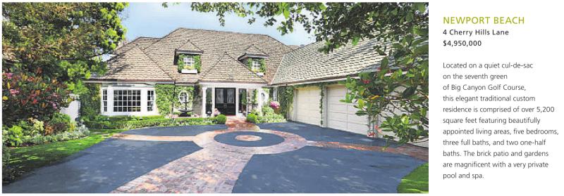 NEWPORT BEACH 4 Cherry Hills Lane $4,950,000 Located on a quiet cul-de-sac on the seventh green of Big Canyon Golf Course, this elegant traditional custom residence is comprised of over 5,200 square feet featuring beautifully appointed living areas, five bedrooms, three full baths, and two one-half baths. The brick patio and gardens are magnificent with a very private pool and spa. See also