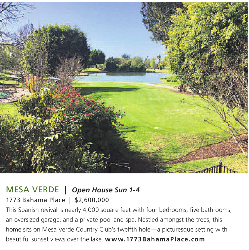MESA VERDE | Open House Sun 1-4 1773 Bahama Place | $2,600,000 This Spanish revival is nearly 4,000 square feet with four bedrooms, five bathrooms, an oversized garage, and a private pool and spa. Nestled amongst the trees, this home sits on Mesa Verde Country Club’s twelfth hole—a picturesque setting with beautiful sunset views over the lake. www.1773BahamaPlace.com