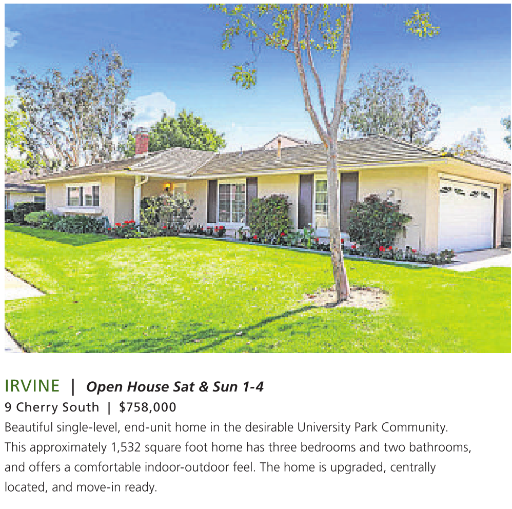 IRVINE | Open House Sat & Sun 1-4 9 Cherry South | $758,000 Beautiful single-level, end-unit home in the desirable University Park Community. This approximately 1,532 square foot home has three bedrooms and two bathrooms, and offers a comfortable indoor-outdoor feel. The home is upgraded, centrally located, and move-in ready.