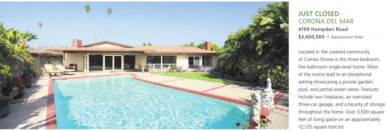 JUST CLOSED CORONA DEL MAR 4709 Hampden Road $3,600,000 | Represented Seller Located in the coveted community of Cameo Shores is this three bedroom, five bathroom single-level home. Most of the rooms lead to an exceptional setting showcasing a private garden, pool, and partial ocean views. Features include two fireplaces, an oversized three-car garage, and a bounty of storage throughout the home. Over 3,500 square feet of living space on an approximately 12,125 square foot lot.
