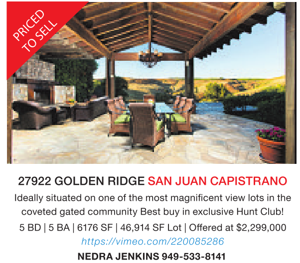 27922 GOLDEN RIDGE SAN JUAN CAPISTRANO Ideally situated on one of the most magnificent view lots in the coveted gated community Best buy in exclusive Hunt Club! 5BD|5BA|6176SF|46,914 SF Lot |Offered at $2,299,000 https://vimeo.com/220085286 NEDRA JENKINS 949-533-8141