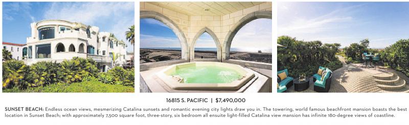 16815 S. PACIFIC | $7,490,000 SUNSET BEACH: Endless ocean views, mesmerizing Catalina sunsets and romantic evening city lights draw you in. The towering, world famous beachfront mansion boasts the best location in Sunset Beach; with approximately 7,500 square foot, three-story, six bedroom all ensuite light-filled Catalina view mansion has infinite 180-degree views of coastline.