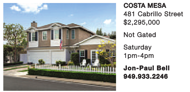 COSTA MESA 481 Cabrillo Street $2,295,000 Not Gated Saturday 1pm-4pm Jon-Paul Bell 949.933.2246