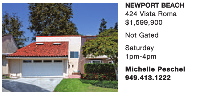 NEWPORT BEACH 424 Vista Roma $1,599,900 Not Gated Saturday 1pm-4pm Michelle Peschel 949.413.1222