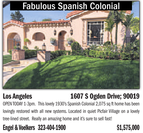 Fabulous Spanish Colonial Los Angeles 1607SOgdenDrive; 90019 OPENTODAY1-3pm. Thislovely1930’sSpanish Colonial2,075 sq ft homehas been lovingly restored with all new systems. Located inquiet Picfair Village on alovely tree-lined street. Really an amazing home andit’ssure to sell fast! Engel &Voelkers 323-404-1900 $1,575,000