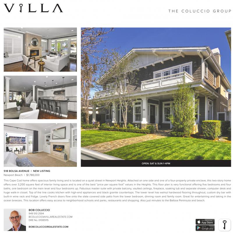 T H E C O L U C C I O G R O U P OPEN: SAT &SUN 1-4PM 518 BOLSA AVENUE | NEW LISTING Newport Beach | $1,788,000 This Cape Cod home offers spacious family living and is located on a quiet street in Newport Heights. Attached on one side and one of a four-property private enclave, this two-story home offers over 3,200 square feet of interior living space and is one of the best “price per square foot” values in the Heights. This floor plan is very functional offering five bedrooms and four baths, one bedroom on the main level and four bedrooms up. Fabulous master suite with private balcony, vaulted ceilings, fireplace, soaking tub and separate shower, computer desk and huge walk-in closet. Top of the line cooks kitchen with high-end appliances and black granite countertops. The lower level has walnut hardwood flooring throughout, custom dry bar with built-in wine rack and fridge. Lovely French doors flow onto the slate covered side patio from the lower bedroom, dinning room and family room. Great for entertaining and taking in the ocean breezes. This location offers easy access to neighborhood schools and parks, restaurants and shopping. Also just minutes to the Balboa Peninsula and beach. BOB COLUCCIO 949 510 2594 BCOLUCCIO@VILLAREALESTATE.COM DRE No. 01085115 BOBCOLUCCIOREALESTATE.COM