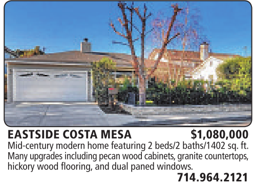 EASTSIDE COSTA MESA $1,080,000 Mid-century modern home featuring 2beds/2 baths/1402 sq. ft. Manyupgradesincluding pecan wood cabinets,granitecountertops, hickory wood flooring, and dual paned windows.
